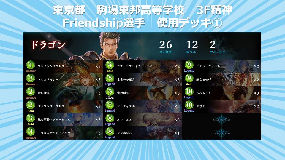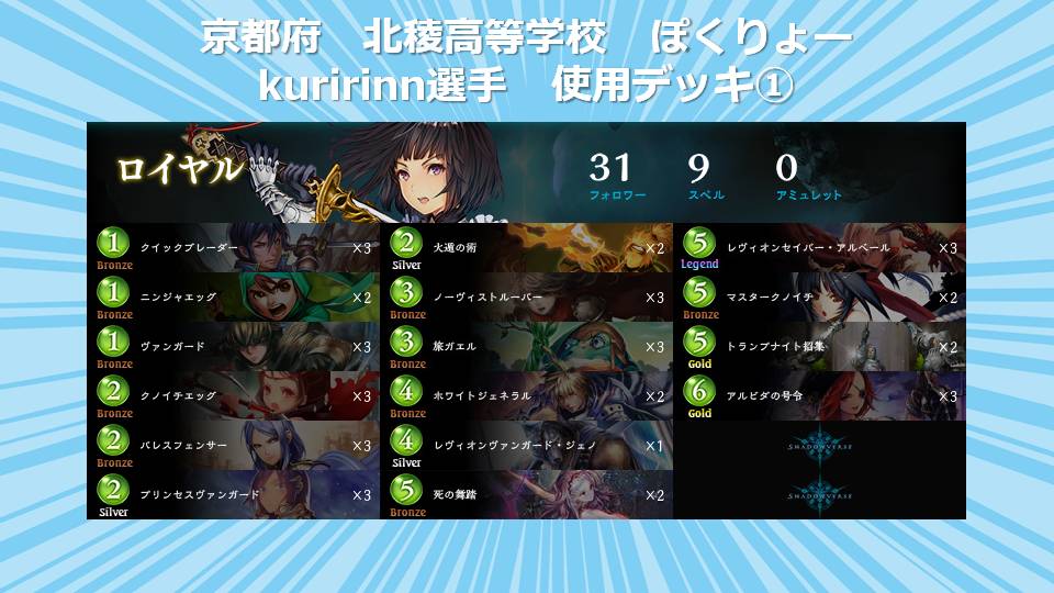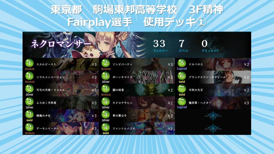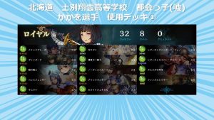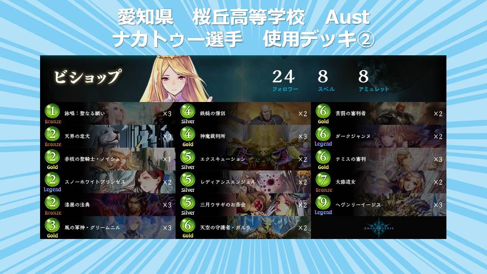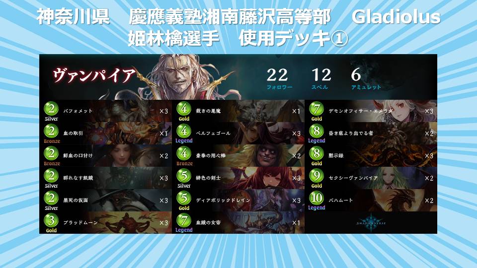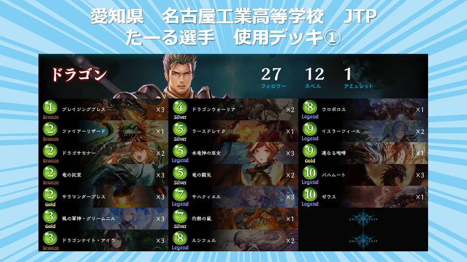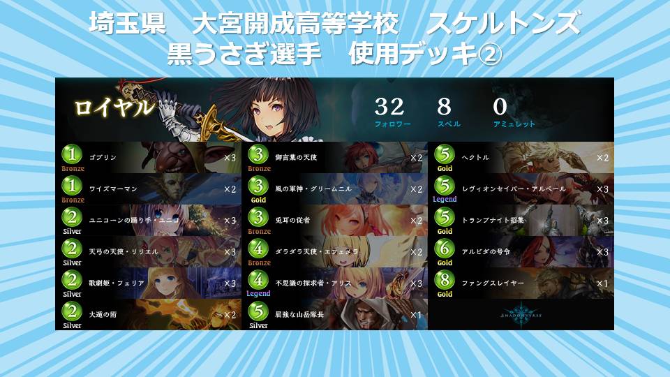 全国高校生シャドウバース選手権運営事務局でございます。 「全国高校生シャドウバース選手権」決勝大会通常対戦A/通常対戦Bに出場する選手が 使用するデッキを公開させて頂きます。 【北海道予選:北海道 士別翔雲高等学校 都会っ子(嘘)】