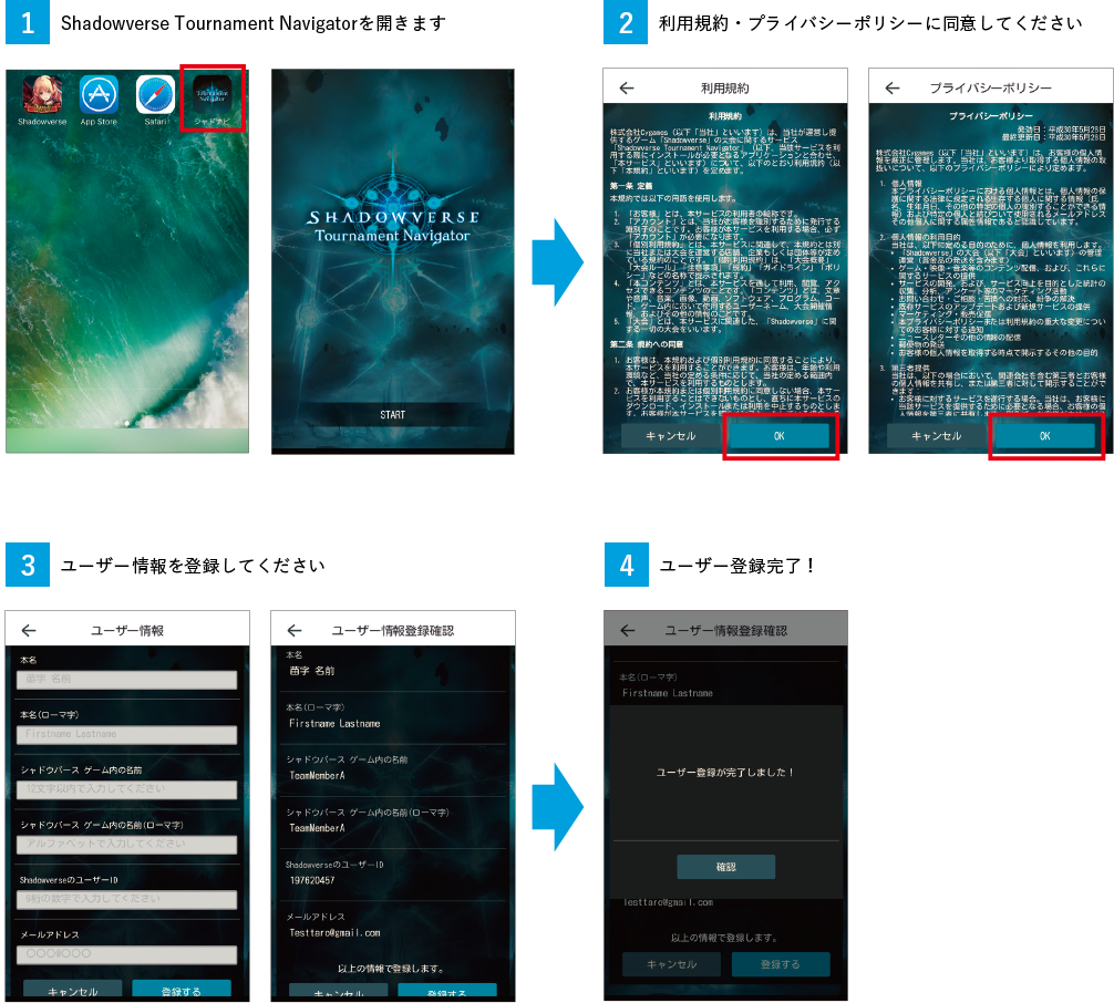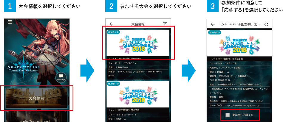 大会エントリーは Shadowverse Tournament Navigator から行います。 大会規約をよくご確認いただいた上で、エントリーを行なってください。また大会当日に受付及び試合結果の報告として使用するため、アンインストールしないようお願いいたします。